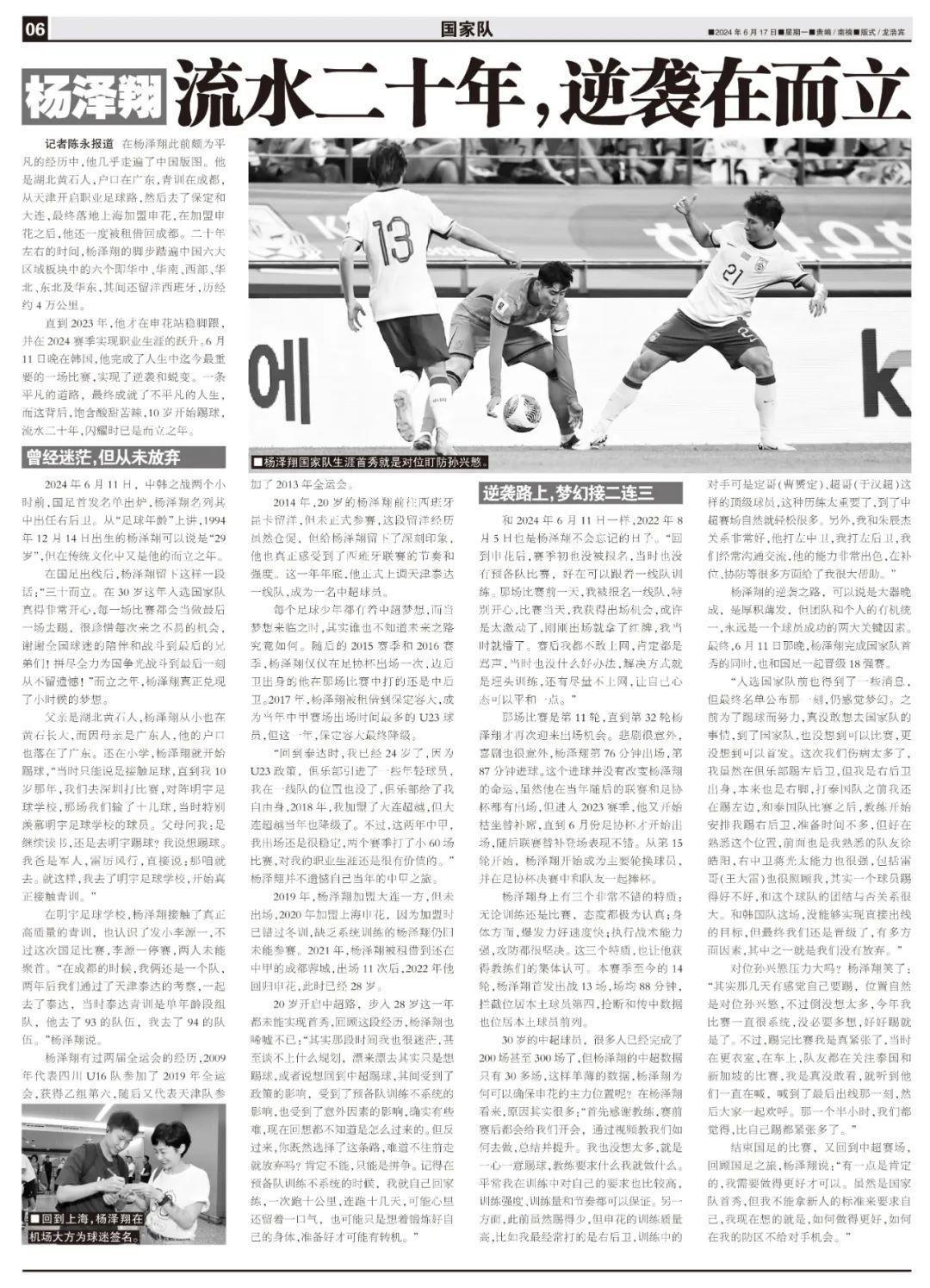 2024年6月11日,中韓之戰兩個小時前,國足首發名單出爐,楊澤翔名列其中出任右後衛。從“足球年齡”上講,1994年12月14日出生的楊澤翔可以說是“29歲”,但在傳統文化中又是他的而立之年。