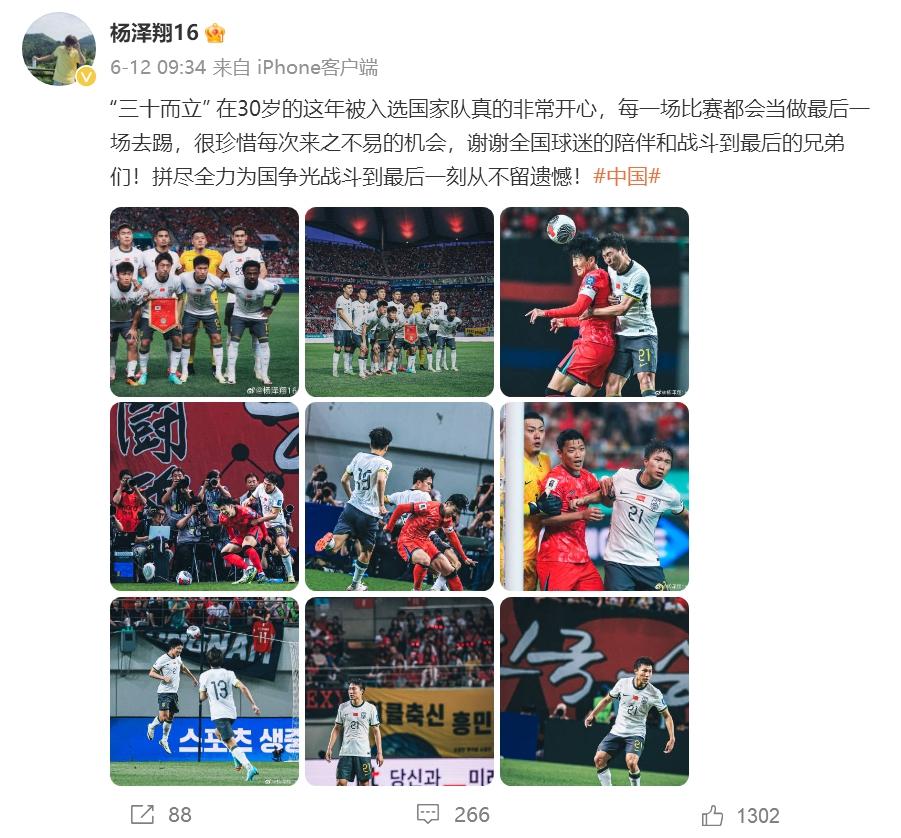 在國足出線後,楊澤翔留下這樣一段話:“三十而立。在30歲這年入選國家隊真得非常開心,每一場比賽都會當做最後一場去踢,很珍惜每次來之不易的機會,謝謝全國球迷的陪伴和戰鬥到最後的兄弟們!拼盡全力爲國爭光戰鬥到最後一刻從不留遺憾!”而立之年,楊澤翔真正兌現了小時候的夢想。