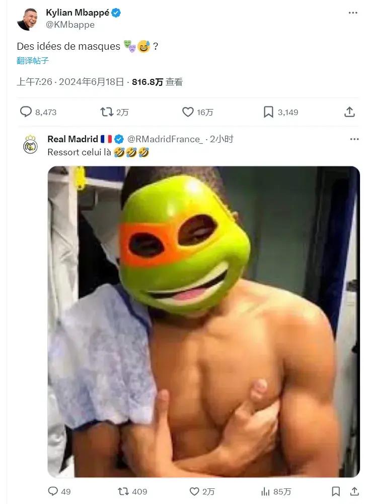 姆巴佩將進行保守治療並戴着面部護具訓練,心情不錯的姆巴佩賽後居然在社媒賬號徵集防護面具造型。皇馬法語社媒以及大部分球迷們建議戴着“忍者神龜”造型防護面具,也有人認爲姆巴佩應像經典電影《鐵面人》中的法王路易十四與弟弟菲利普一樣,戴上造型更誇張的“鐵面具”。