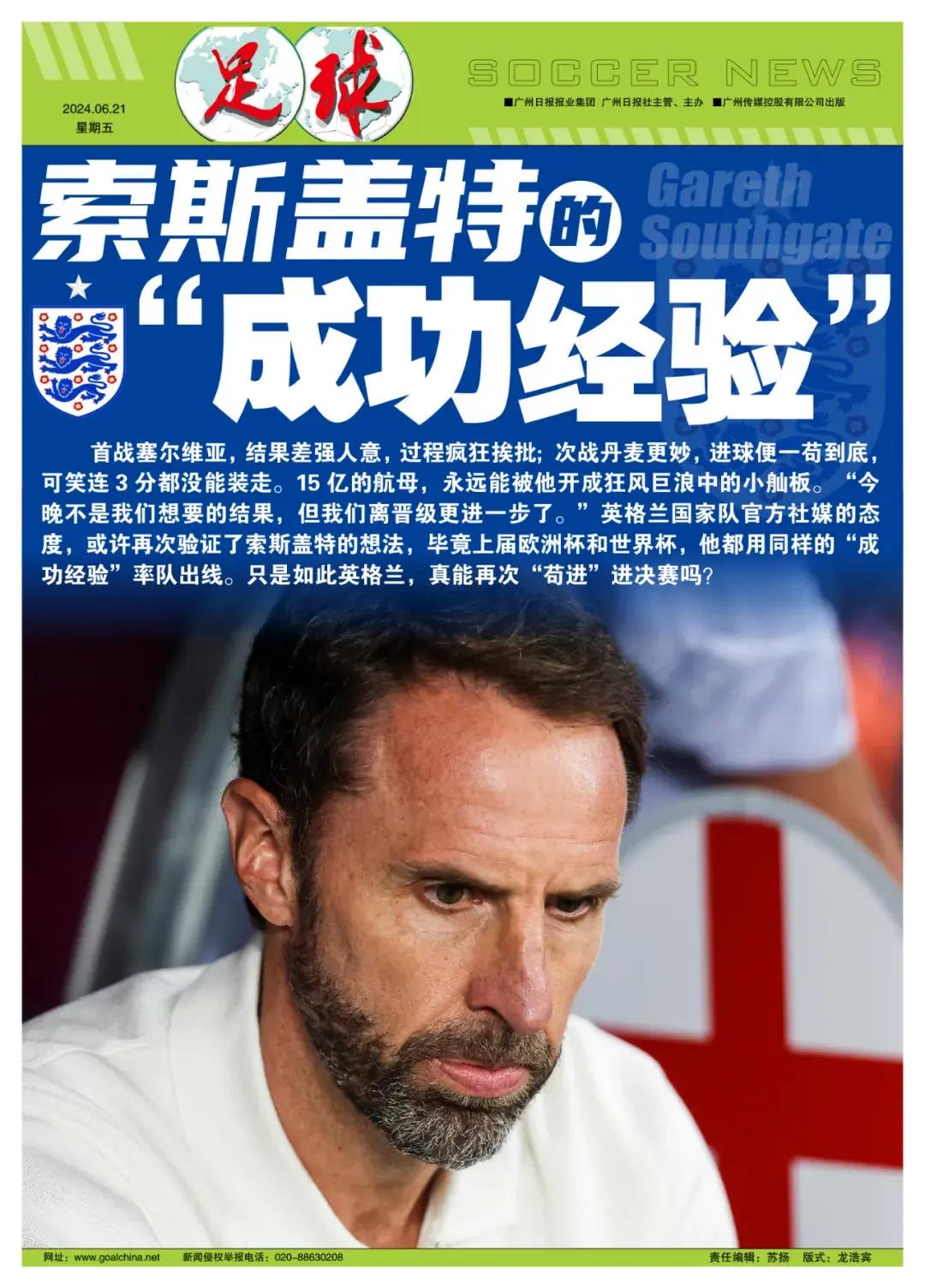 記者韓毅禧評述 所謂“希望越大,失望越大”——國足球迷熟悉,英格蘭球迷也不陌生,如果還要找個“倒黴羣體”疊加心靈創傷,那隻能是對索斯蓋特的英格蘭隊抱有幻想的中國三獅球迷。首戰1比0塞爾維亞,結果差強人意,過程瘋狂挨批;次戰1比1丹麥更妙,進球便一苟到底,可笑連3分都沒能打包帶走。15億的航母,永遠能被他開成狂風巨浪中的小舢板。迷信“苟”字訣的索斯蓋特,如何能不讓球迷沮喪?
