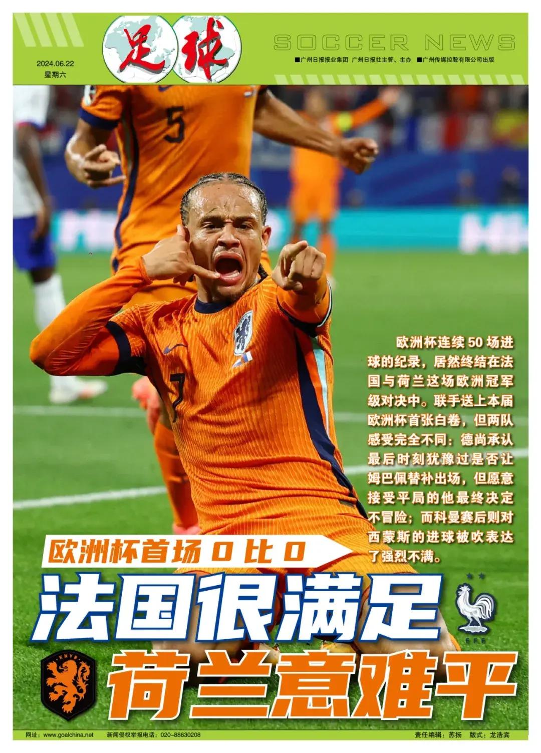 記者寒冰報道 歐洲盃連續50場進球的紀錄,居然終結在法國與荷蘭這場歐洲冠軍級比賽上。兩支攻擊力毋庸置疑的球隊交出本屆歐洲盃首張白卷,但感受完全不同:儘管姆巴佩帶着面具多次在場邊熱身,保守的德尚還是不願冒險,寧可看着格列茲曼不斷浪費進球機會;荷蘭隊則抱怨VAR對西蒙斯進球無效漫長的裁定,這個判罰也引發了一定爭議。