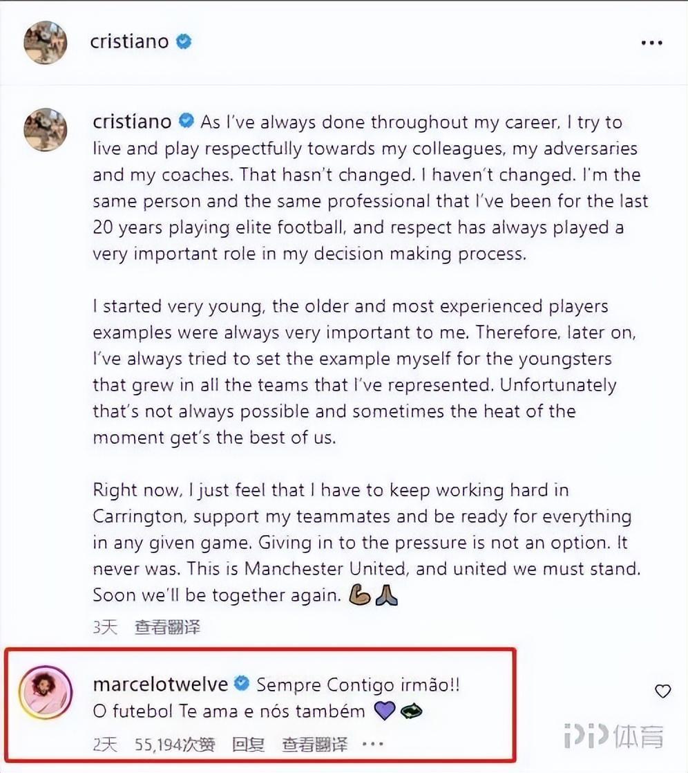 不過,C羅在當年在皇馬最好的兄弟馬塞洛發聲支持了,在C羅的聲明下,馬塞洛評論道:永遠與你同在,兄弟!足球愛你,我們也愛你。這條評論被點讚了5萬多次。