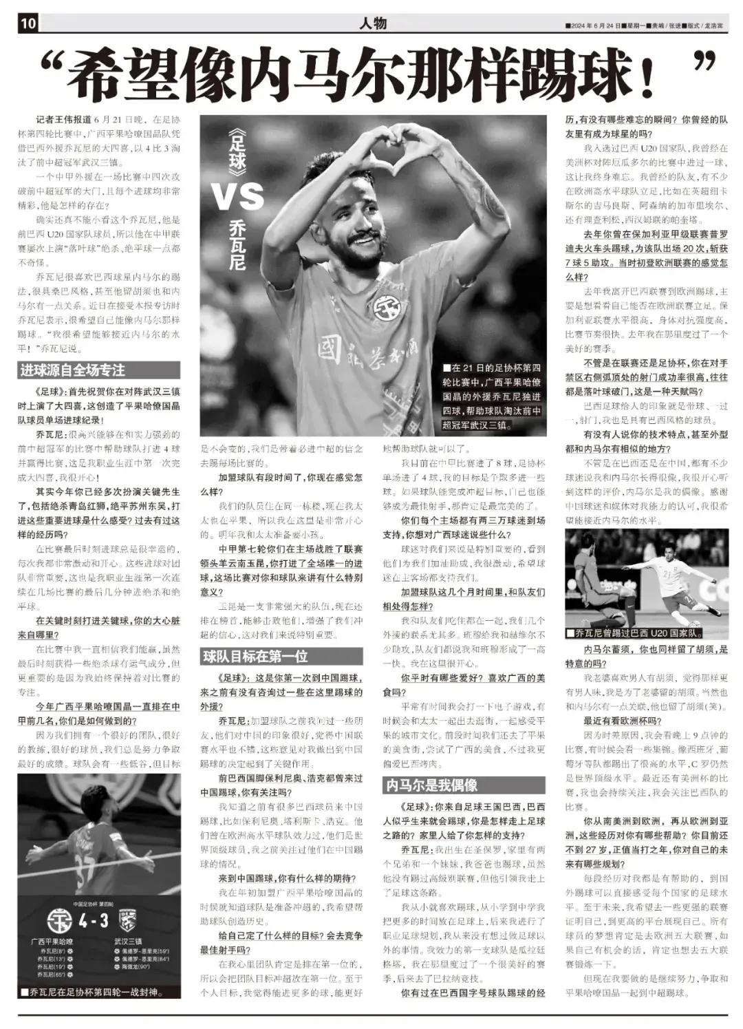 ◆《足球》:首先祝賀你在對陣武漢三鎮時上演了大四喜,這創造了平果哈僚國晶隊球員單場進球紀錄!