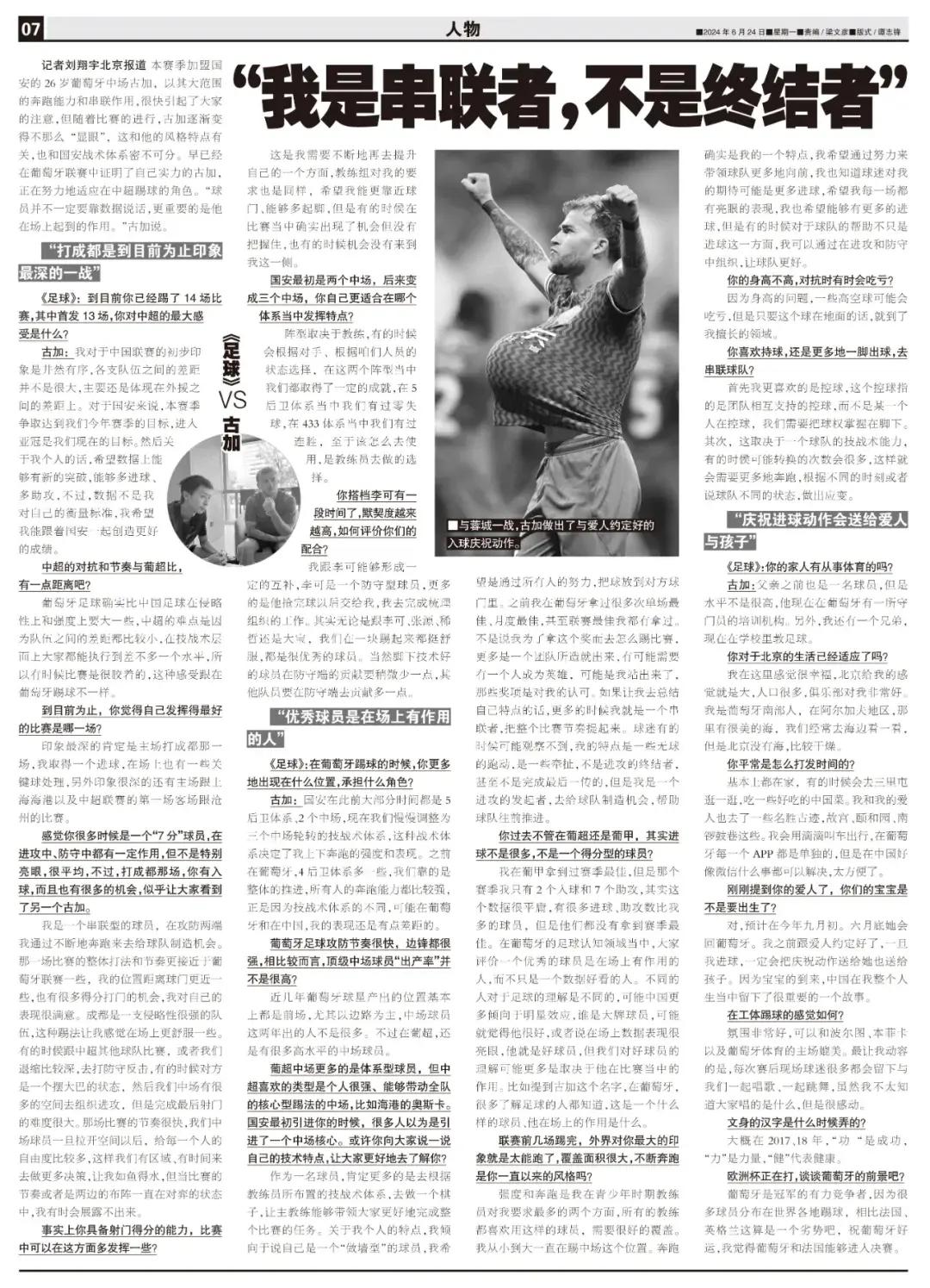 記者劉翔宇報道 本賽季加盟國安的26歲葡萄牙中場古加,以其大範圍的奔跑能力和串聯作用,很快引起了大家的注意,但隨着比賽的進行,古加逐漸變得不那麼“顯眼”,這和他的風格特點有關,也和國安戰術體系密不可分。早已經在葡萄牙聯賽中證明了自己實力的古加,正在努力地適應在中超踢球的角色。“球員並不一定要靠數據說話,更重要的是他在場上起到的作用。”古加說。