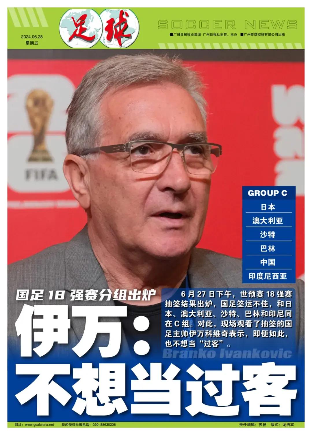 記者陳永報道 6月27日下午,世預賽18強賽抽籤結果出爐,國足籤運不佳,和日本、澳大利亞、沙特、巴林以及印尼同在C組。對此,現場觀看了抽籤的國足主帥伊萬科維奇表示,即便如此,也不想當“過客”。