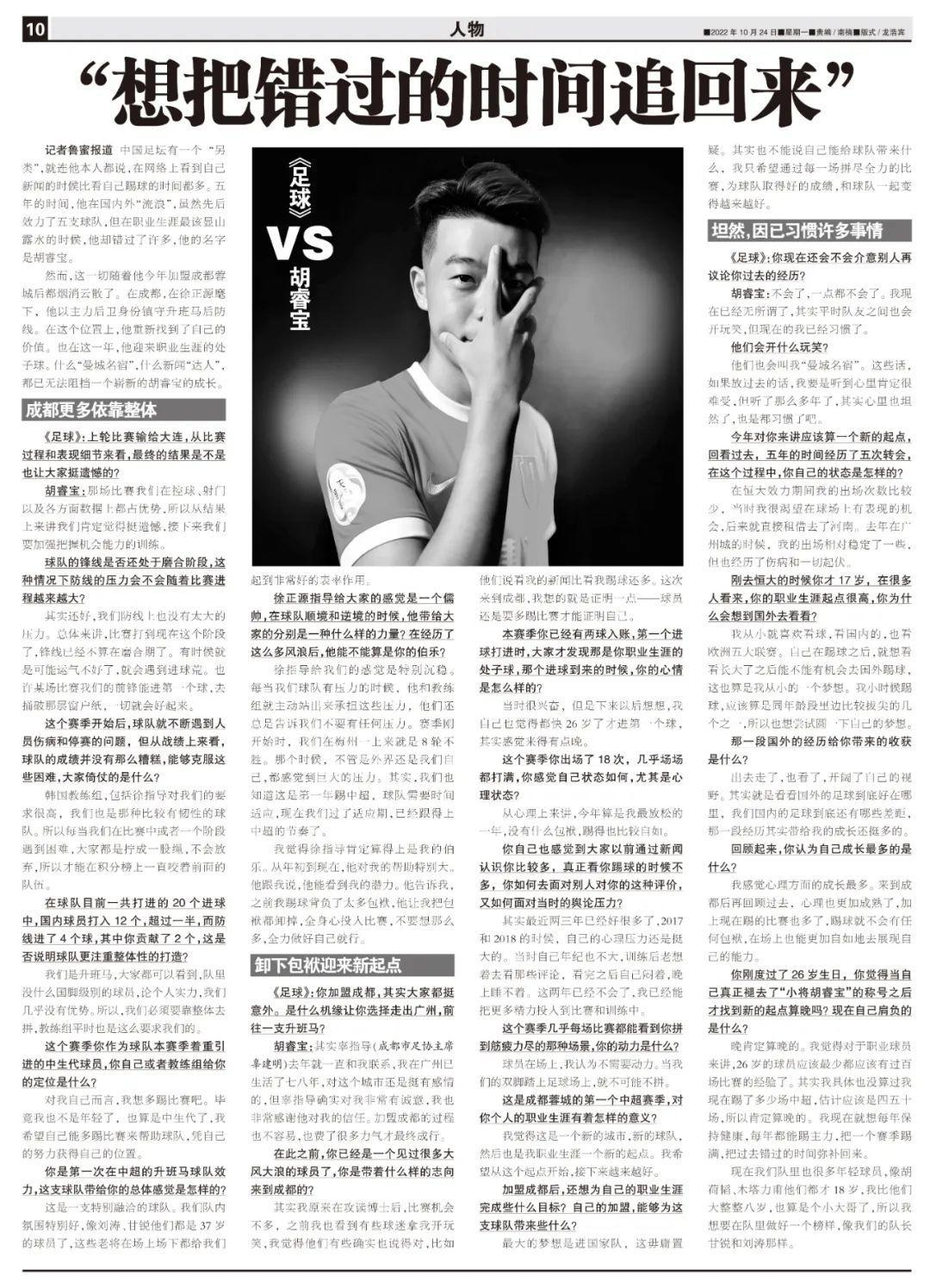 胡睿寶:其實辜指導(成都市足協主席辜建明)去年就一直和我聯繫,我在廣州已生活了七八年,對這個城市還是挺有感情的,但辜指導確實對我非常有誠意,我也非常感謝他對我的信任。加盟成都的過程也不容易,也費了很多力氣才最終成行。