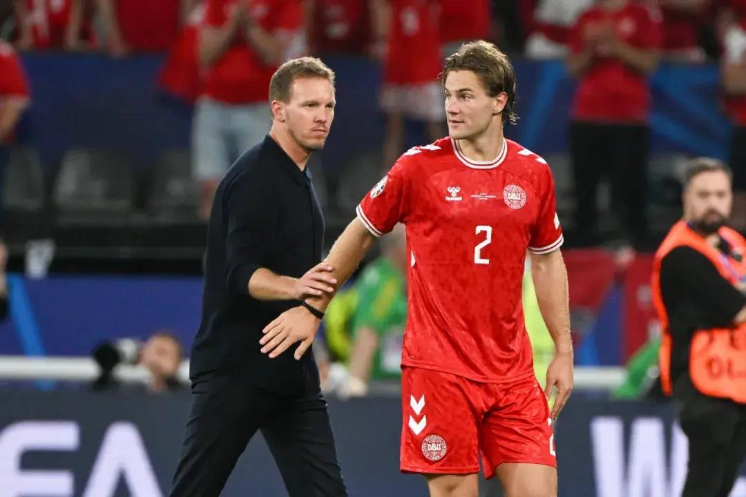 這兩次連續不利於丹麥隊的VAR判罰,明顯影響了丹麥球員的心態。納格爾斯曼隨即派上菲爾克魯格、埃姆雷·詹,加上施洛特貝克,3名多特蒙德球員爲主場帶來了球迷的空前熱情。4分鐘後施洛特貝克長傳助攻穆西亞拉,尼日利亞混血邊鋒鎖定勝局。雖然之後哈弗茨和維爾茨又先後浪費了單刀機會,但2比0足以確保德國隊時隔8年再入歐洲盃8強。