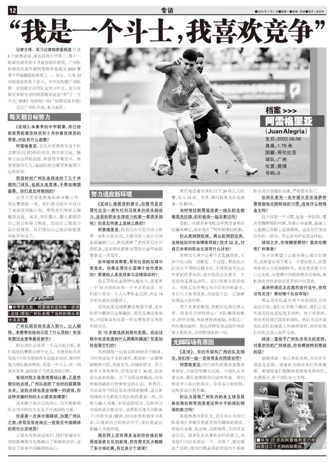 記者王偉、實習記者陸家豪報道 打進8個聯賽進球,接連獲得中甲第二、第十一輪最佳球員和5月最佳球員獎項,廣州隊的哥倫比亞外援阿雷格利亞成爲2024賽季中甲最耀眼的球星之一。