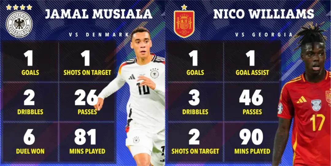 本屆歐洲盃小組賽和1/8決賽,西班牙和德國隊是邊鋒戰術運用最爲得當的勁旅。西班牙的尼科·威廉姆斯和亞馬爾,堪稱本屆盃賽最強也相對最“傳統”的雙翼,相比之下,德國隊的穆西亞拉和維爾茨則習慣切入內線製造殺機。西班牙雙邊鋒此前4戰,累計過人20次射入1球,德國雙邊鋒則累計過人17次射入4球。兩支球隊是本屆盃賽比賽策略最不保守的強隊,且各有本屆賽事發揮穩定的指揮官——羅德里和克羅斯,這場“冠軍決”,具備成爲大賽名局的所有條件。