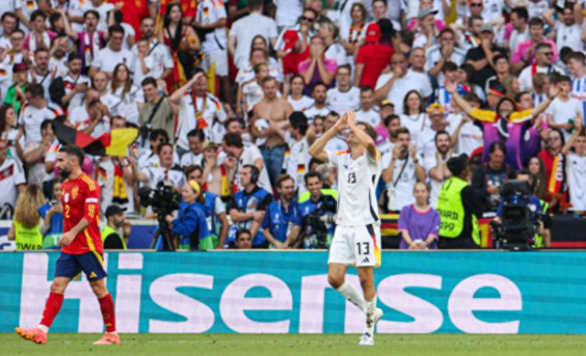 歐洲盃1/4決賽,奧爾莫首開記錄,維爾茨89分鐘扳平,梅里諾加時賽頭球絕殺,最終德國隊被西班牙2-1淘汰出局。