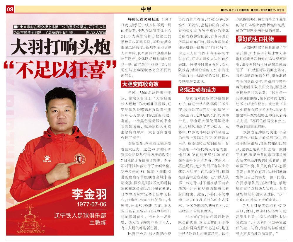 7月6日是李金羽的47歲生日,賽後,球迷們在場內爲他高唱生日歌,“家鄉的球迷太讓我感動了,今天的勝利就是我最好的生日禮物,希望能夠給他們帶去更多的勝利和喜悅。”