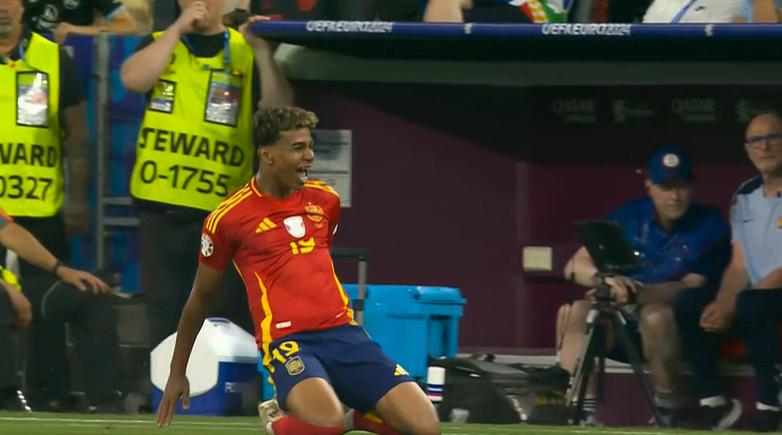 第21分鐘時,亞馬爾禁區外圍內切後左腳兜出一記世界波,擦着左立柱內側飛進球門,西班牙扳平1-1。