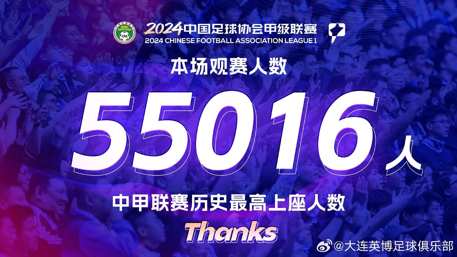 55016人,英博主場梭魚灣足球場創造了中甲歷史最高上座人數紀錄,同時也打破了6月30日由北京工體創造的54189人的本賽季國內職業聯賽最高現場觀衆人數紀錄!今年以來,梭魚灣已有5場比賽觀衆人數位列中甲觀衆統計歷史TOP10,該項統計前6都是“大連製造”!
