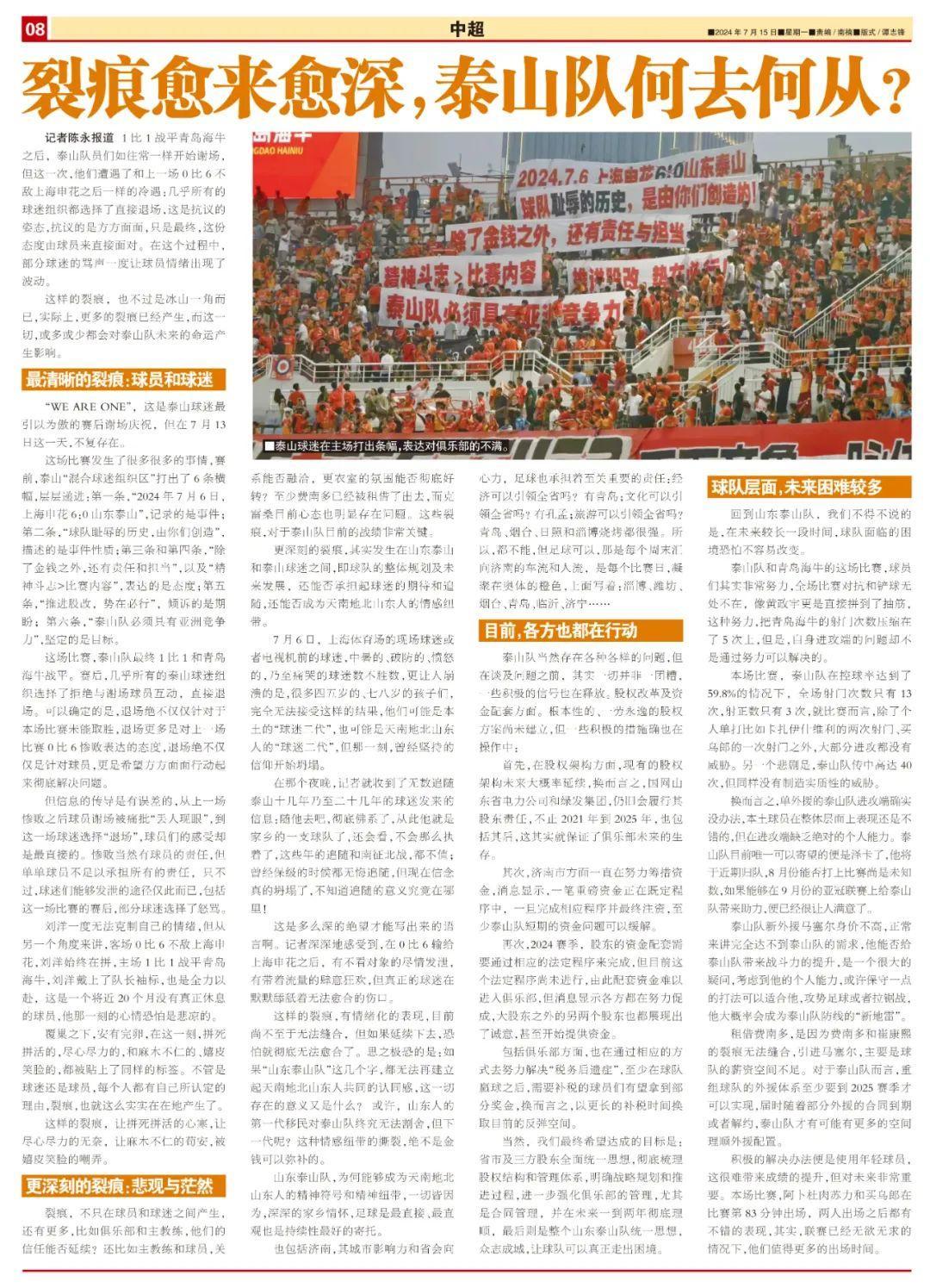 更深刻的裂痕,其實發生在山東泰山和泰山球迷之間,即球隊的整體規劃及未來發展,還能否承擔起球迷的期待和追隨,還能否成爲天南地北山東人的情感紐帶。