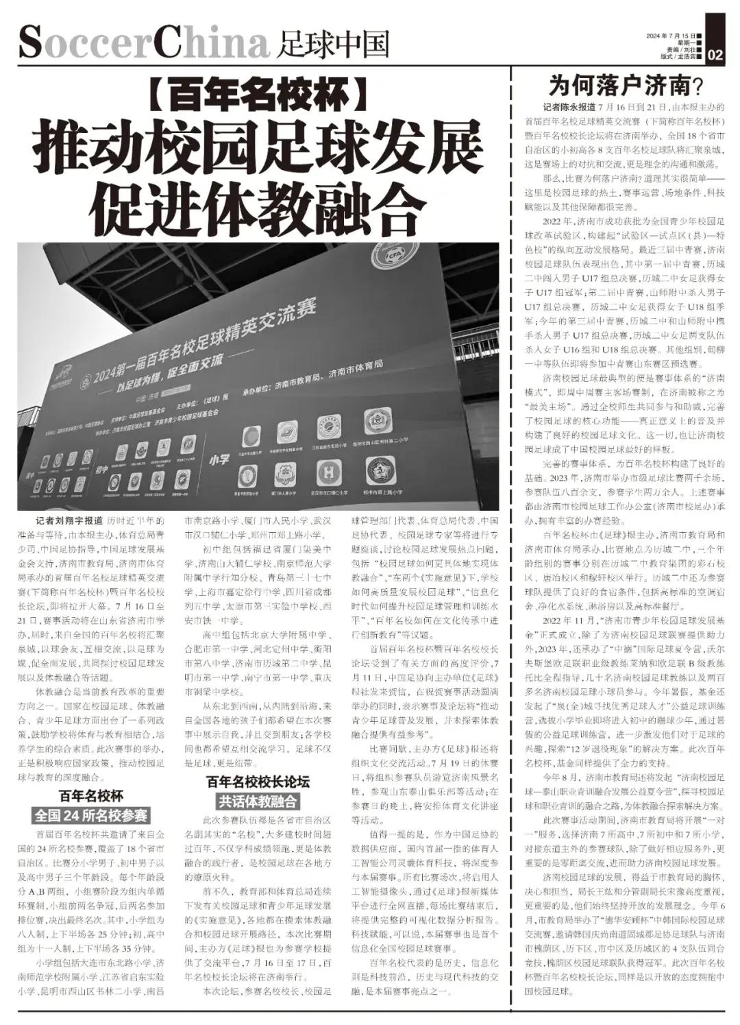 記者陳永報道 7月16日到21日,由本報主辦的首屆百年名校足球精英交流賽(下簡稱百年名校杯)暨百年名校校長論壇將在濟南舉辦,全國18個省市自治區的小初高各8支百年名校足球隊將匯聚泉城,這是賽場上的對抗和交流,更是理念的溝通和激盪。