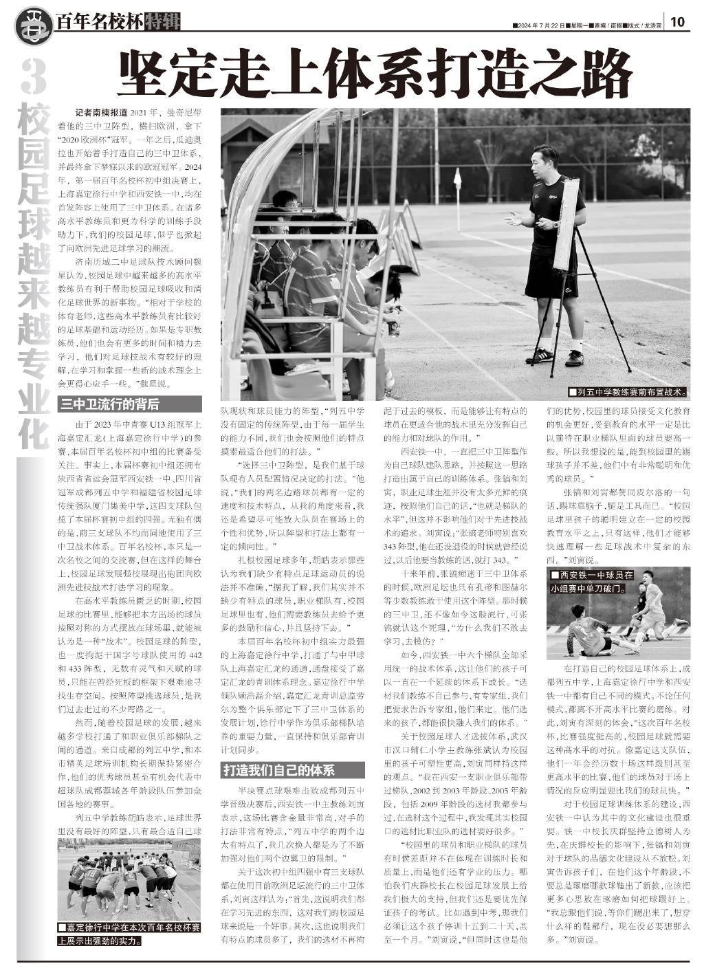 由於2023年中青賽U13組冠軍上海嘉定匯龍(上海嘉定徐行中學)的參賽,本屆百年名校杯初中組的比賽備受關注。事實上,本屆盃賽初中組還擁有陝西省省運會冠軍西安鐵一中、四川省冠軍成都列五中學和福建省校園足球傳統強隊廈門集美中學,這四支球隊包攬了本屆盃賽初中組的四強。無獨有偶的是,前三支球隊不約而同地使用了三中衛戰術體系。百年名校杯,本只是一次名校之間的交流賽,但在這樣的舞臺上,校園足球發展強校展現出抱團向歐洲先進技戰術打法學習的現象。