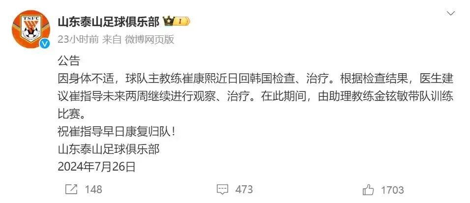 26日上午,山東泰山發佈公告:“因身體不適,球隊主教練崔康熙近日回韓國檢查、治療。根據檢查結果,醫生建議崔指導未來兩週繼續進行觀察、治療。在此期間,由助理教練金鉉敏帶隊訓練比賽。”