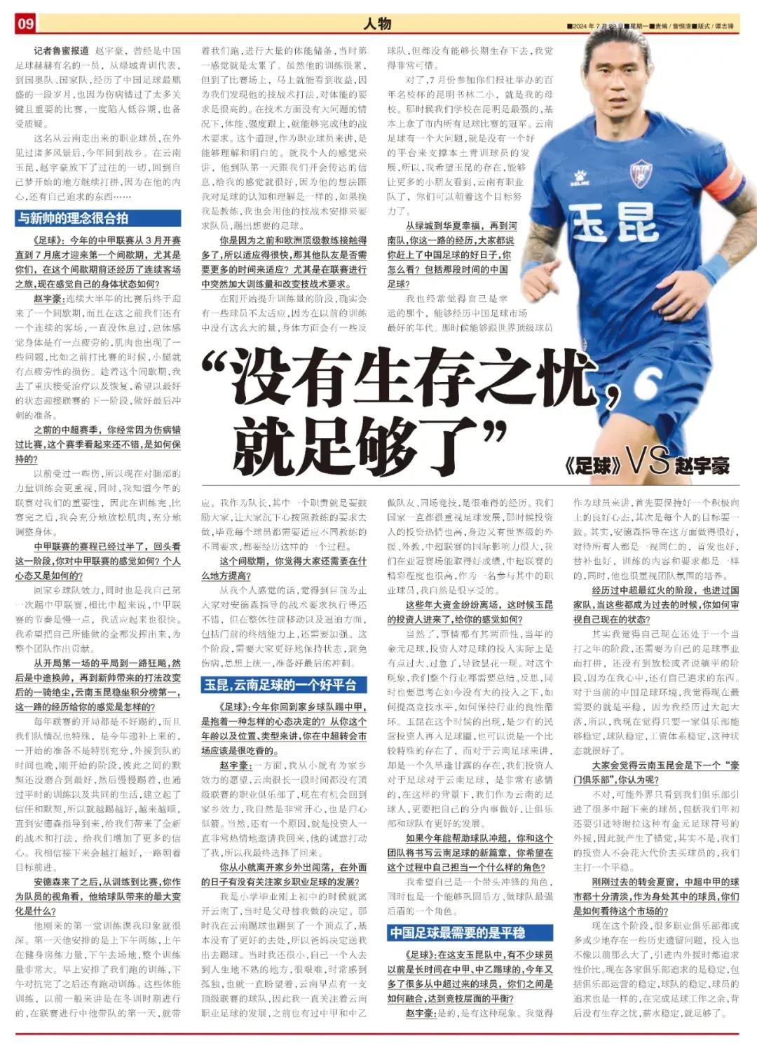 趙宇豪:一方面,我從小就有爲家鄉效力的願望,雲南很長一段時間都沒有頂級聯賽的職業俱樂部了,現在有機會回到家鄉效力,我自然是非常開心,也是歸心似箭。當然,還有一個原因,就是投資人一直非常熱情地邀請我回來,他的誠意打動了我,所以我最終選擇了回來。