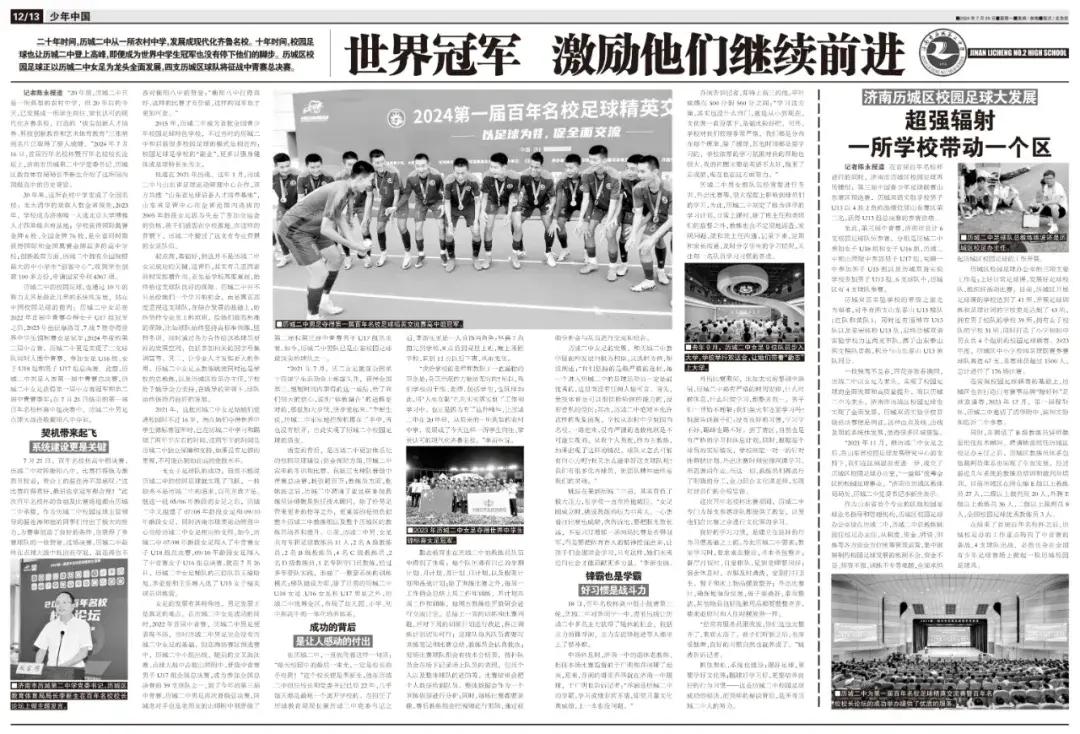 歷城二中的校園足球,也通過10年的努力尤其是最近幾年的系統性發展,站在中國校園足球的前列:歷城二中女足在2022年首屆中青賽奪得女子U17組冠軍之後,2023年出征摩洛哥,7戰7勝奪得世界中學生錦標賽女足冠軍;2024年度的第三屆中青賽,歷城二中更是實現了三支球隊同時入圍中青賽,參加女足U16組、女子U18組和男子U17組總決賽。此前,歷城二中男足入圍第一屆中青賽總決賽,歷城二中女足獲得第一屆中青賽冠軍和第二屆中青賽季軍;在7月21日結束的第一屆百年名校杯高中組決賽中,歷城二中男足點球大戰擊敗衡陽八中奪冠。
