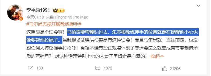 有媒體人在微博上爲馬爾尚辯解:“這明顯是個誤會啊!馬爾尚要彎腰鑽過去,朱志根教練伸手的位置就像在提醒他小心也像要幫他拉繩子。而且馬爾尚就一直往前走,也沒跟任何人停留握手打招呼!”