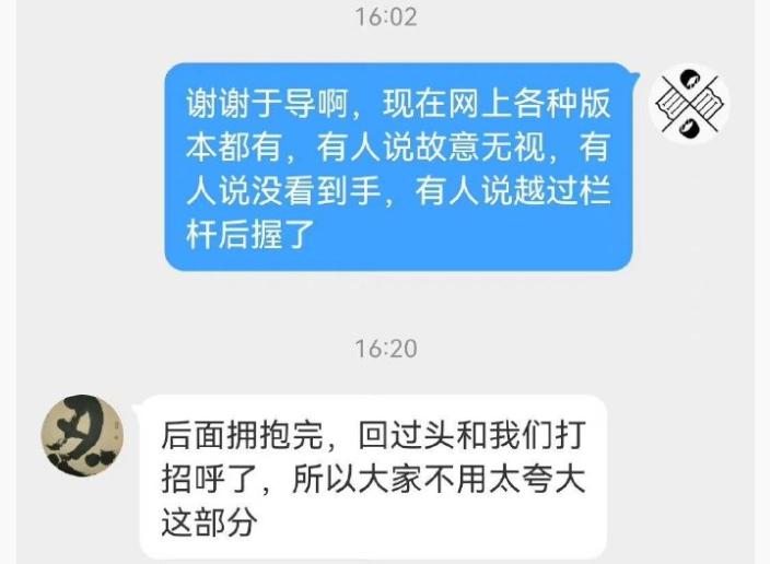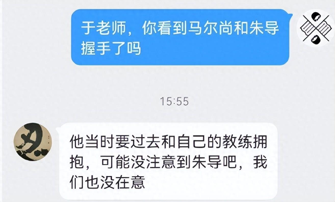 在場的國家隊教練澄清馬爾尚故意無視朱指導握手:“當時他要過去擁抱自己的教練,可能沒有注意到朱導吧,我們也沒在意。後面擁抱完後,回過頭和我們打招呼了,所以大家不用太誇大這部分。”
