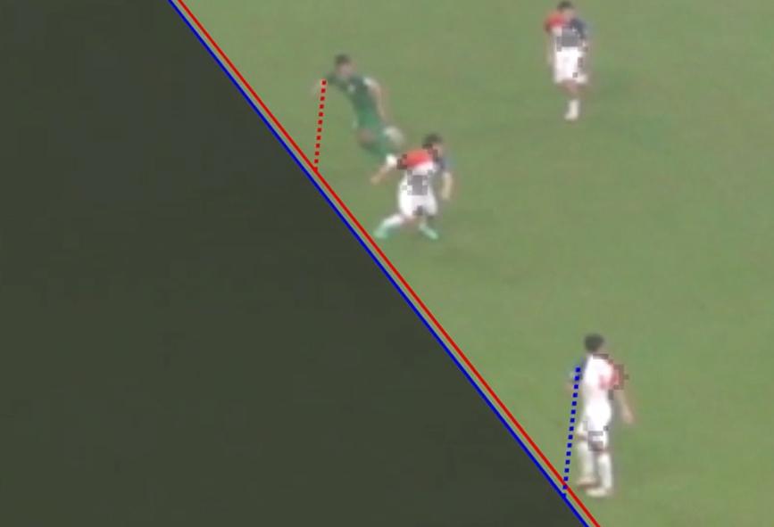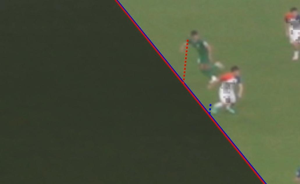 當時花了三分鐘劃線,最後連“最後一名防守球員”都沒找對。重新劃線顯示,上海申花的最後一名防守球員是4號的蔣聖龍,而不是5號的朱辰傑。這樣,可以很清楚看出王子銘沒有越位。