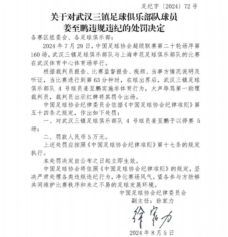 足協在公告中表示,7月29日,在三鎮主場對陣申花的比賽中,根據裁判員報告、比賽監督報告、視頻、當事方情況說明及聽證,當比賽進行到第63分鐘時,在球出界後,姜至鵬實施非體育行爲,大聲辱罵第一助理裁判員(邊裁),裁判員出示紅牌將其罰令出場。處以追加停賽5場,罰款5萬元人民幣的處罰。