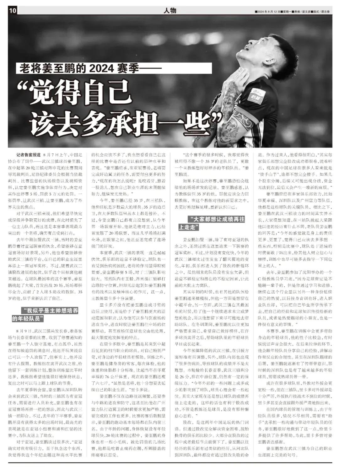 姜至鵬曾經在多傢俱樂部效力,比如華夏幸福、深圳隊以及廣州富力等隊伍,他都是這些球隊的關鍵隊員,相比之下,姜至鵬在武漢三鎮效力的時間其實並不長,大家很想知道,在三鎮隊挑起大梁跟他以往的經歷有什麼不同,老隊員姜至鵬的回答是:“今年的感覺就是身上的責任更多、更重了,覺得自己應該去多承擔一些東西,特別是比賽中,球隊處於逆境的時候要敢於站出來,給其他人樹立信心與榜樣,訓練中也儘可能多去指導一下同位置上的人。”
