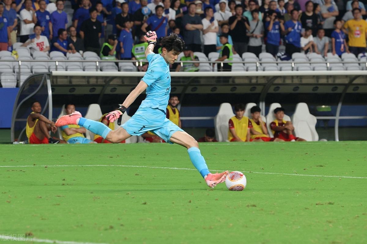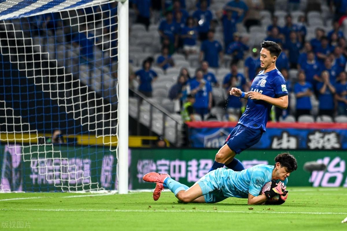 第37分鐘,高天意主罰左側角球,朱辰傑後點衝頂被顏駿凌穩穩抱住;上半場比賽結束,申花0-1落後海港;