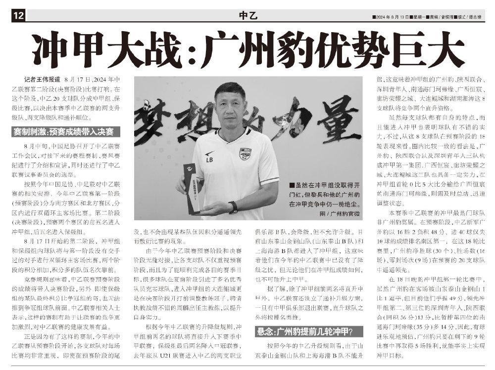 按照今年的中乙升級規則看,由於山東泰山金鋼山隊和上海海港B隊不能升級,這意味着衝甲組的廣州豹、陝西聯合、深圳青年人、南通海門珂締緣、廣西恆宸、廊坊榮耀之城、大連鯤城和湖南湘濤這8支球隊將競爭兩個直升資格。