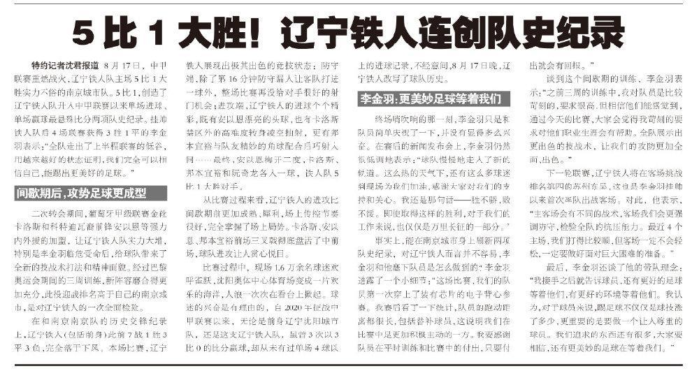 特約記者沈君報道 8月17日,中甲聯賽重燃戰火,遼寧鐵人隊主場5比1大勝實力不俗的南京城市隊。5比1,創造了遼寧鐵人隊升入中甲聯賽以來單場進球、單場贏球最懸殊比分兩項隊史紀錄。掛帥鐵人隊後4場聯賽獲得3勝1平的李金羽表示:“全隊走出了上半程聯賽的低谷,用越來越好的狀態證明,我們完全可以相信自己,能踢出更美好的足球。”