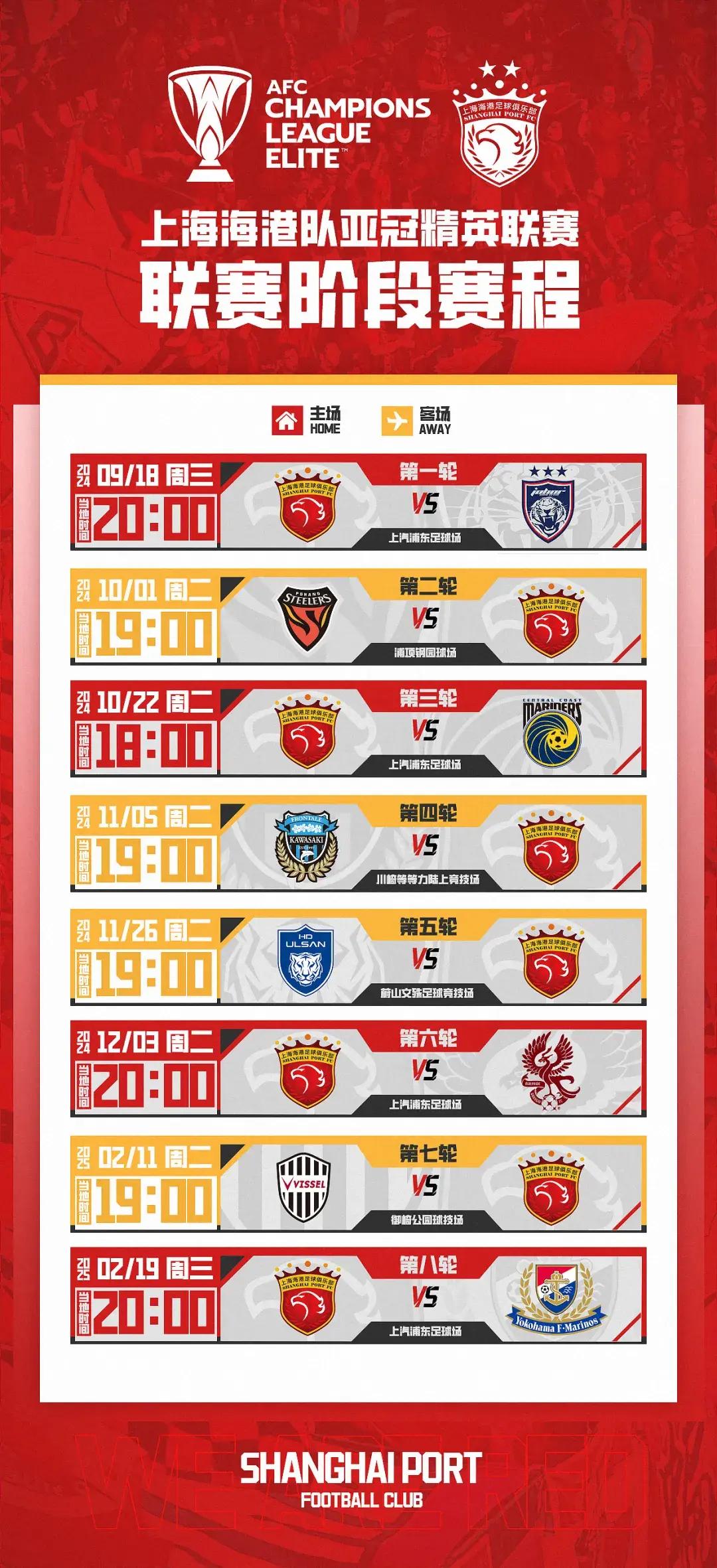 值得一提的是,國足比賽結束後,海港將三線作戰,賽程密集:9月13日,海港中超主場對陣新鵬城;5天后,他們將在亞冠面對柔佛,打響亞冠精英聯賽第一槍;21日中超客場對亞泰;25日足協盃半決賽主場對陣申花;28日中超主場對陣西海岸;10月1日亞冠客戰浦項制鐵。對於海港和穆斯卡特來說,這同樣是不小的挑戰。
