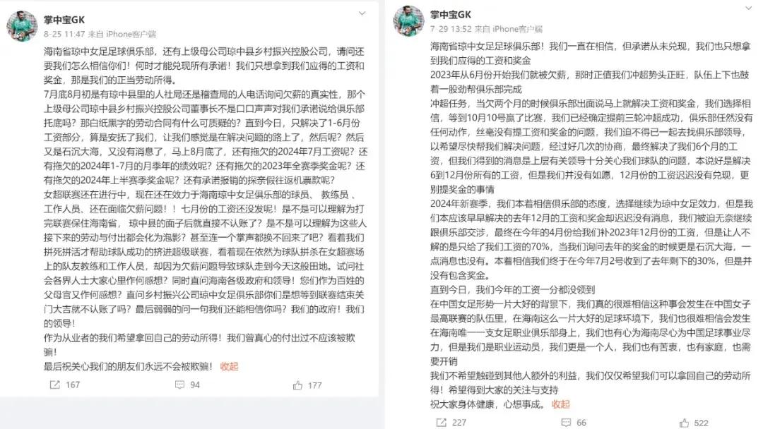 發文者透露,2023年,球隊在提前3輪衝超的情況下,工資和獎金都未及時到位,經過多次協商,去年6個月的工資得到了解決,而12月的工資,在今年幾度交涉後,4月時拿到了70%,剩餘的30%,在7月才收到。而今年上半年6個月的工資也存在拖欠,去年一年的獎金和暫扣的績效,瓊中女足的隊員一直沒有收到。