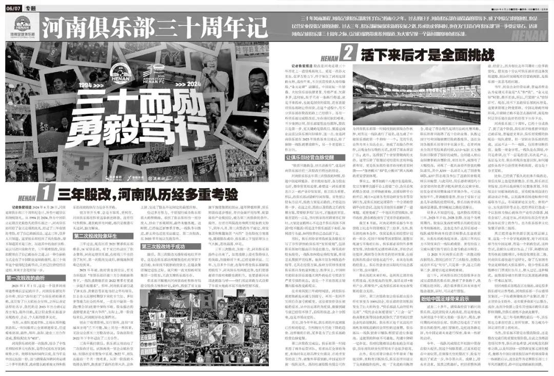 記者魯蜜報道 2024年8月28日,河南足球俱樂部三十週年紀念日,所有中超俱樂部脫帽致禮。從1994到2024,作爲中國職業足球歷史最悠久的俱樂部之一,河南俱樂部歷經了金元足球的洗禮,經過了三年疫情的考驗,有了自己的新活法。過去三年,很多人只知道,這傢俱樂部經歷了兩次股改,卻不知道其實是三次,而這其中的曲折歷程,足以寫進河南體育史。三年艱難股改,俱樂部摸索出了自己的生存之道,以一種全新的方式走在了中國職業足球的前列。在三十週年這個值得紀念的節點,只有記住曾經經歷過的,未來纔會走好每一步。