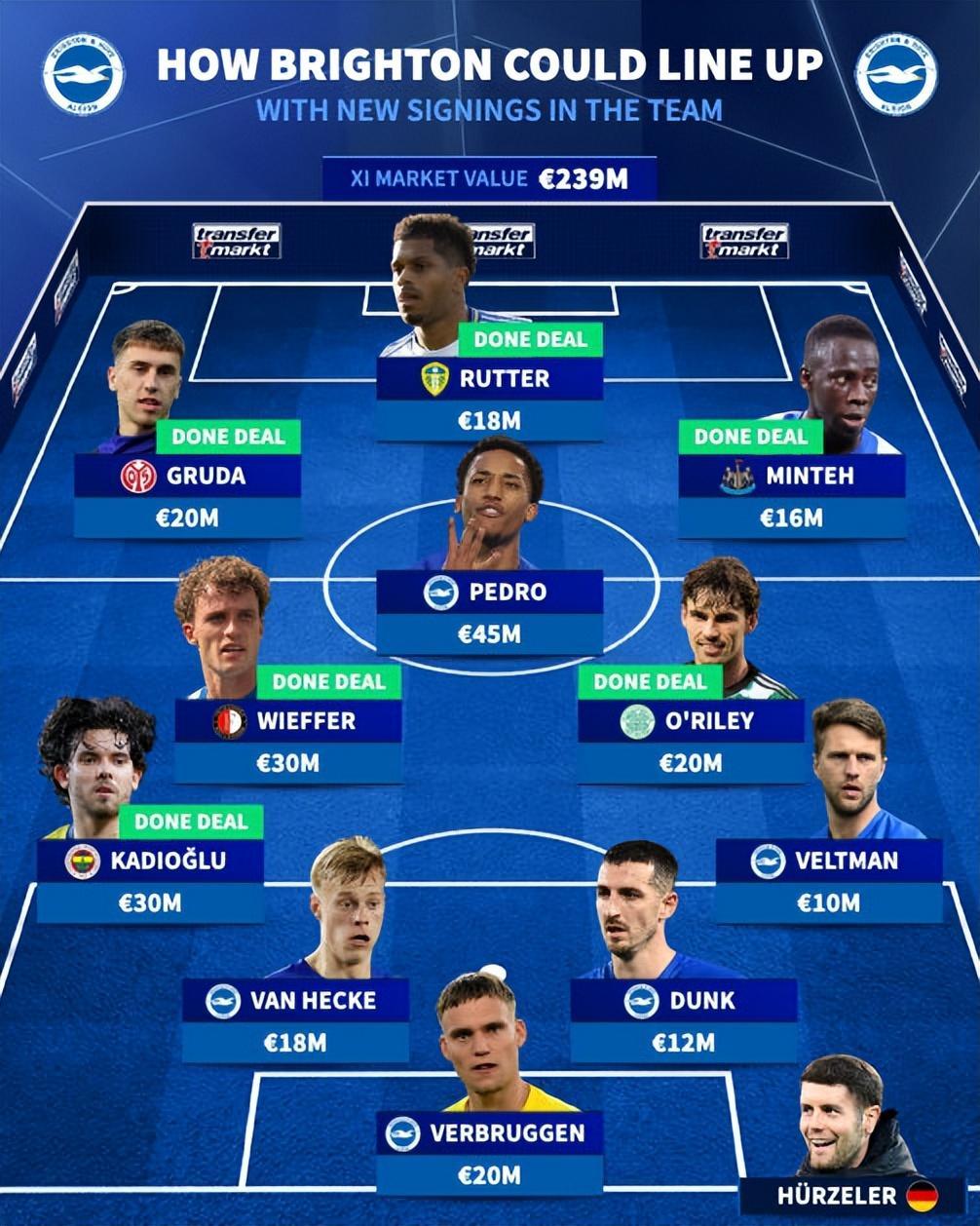 作爲唯一一家非傳統豪門,單一夏窗引援投資突破2億歐元的小球會,布萊頓今夏簽下9名新援。但最貴的利茲聯法國中鋒魯特爾纔不到4700萬歐元,多達5單引援費用在3000-3500萬歐元的區間。包括土耳其左後衛卡德奧盧、荷蘭後腰費弗爾、丹麥中場奧利萊、德國右邊鋒格魯達、岡比亞右邊鋒明特,再加更低價的加納左邊鋒奧斯曼,科特迪瓦中場雅庫耶,所有的2.3億歐元投資,都花在了24歲以下球員身上。其中最小的雅庫耶只有18歲,奧斯曼和明特19歲,格魯達20歲。
