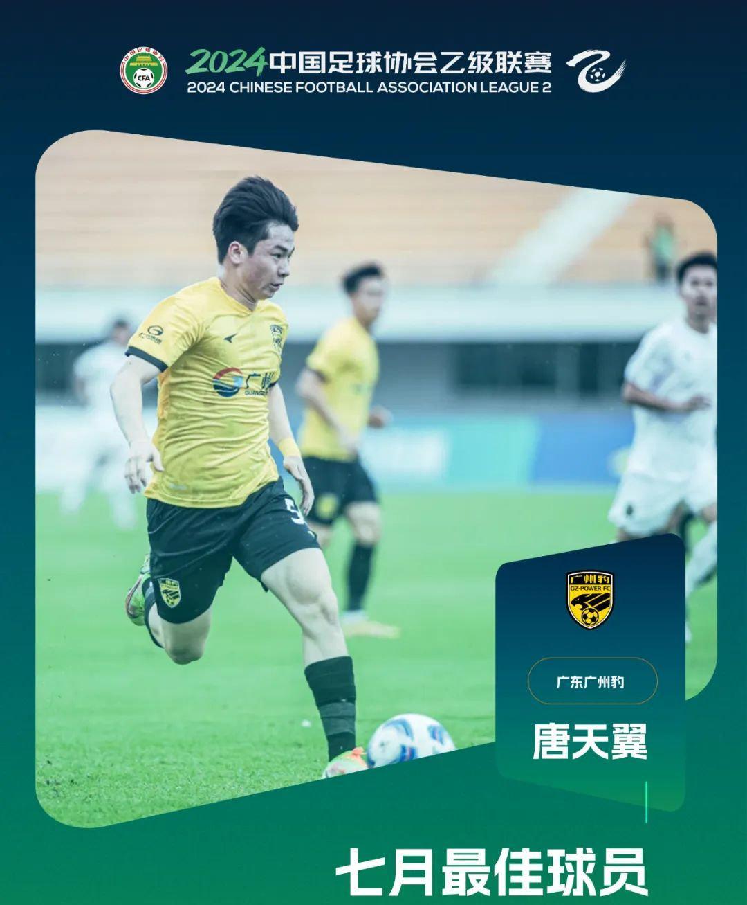 2024中乙聯賽7月份的賽事中,廣州豹取得了四連勝的戰績,以南區第一的身份進入決賽階段爭冠組。年僅17歲的前鋒唐天翼在本階段4場比賽打入5球還貢獻兩次助攻。在第18輪主場8比1戰勝泉州亞新的比賽中,唐天翼在15分鐘內上演了帽子戲法。