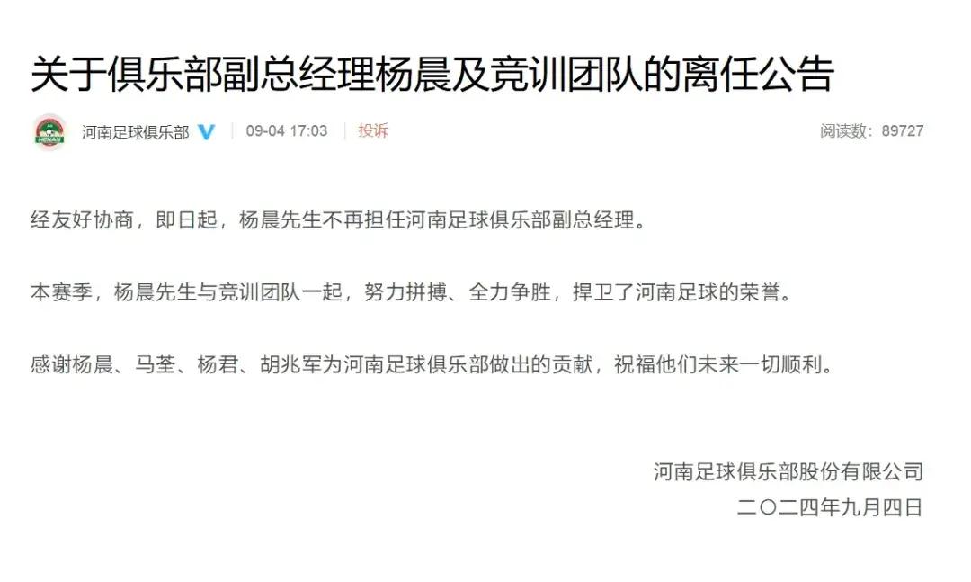 當時事情已經有了緩和,俱樂部也針對“楊晨離職”的消息發佈了官方信息。但到了8月31日球隊收假這天,事情又發生了轉折。楊晨回到鄭州,告知俱樂部,經過了一段時間的思考之後,還是堅持之前的決定,連帶着中方教練組以及領隊也一同辭職。在這個過程中,也有教練組成員曾勸過楊晨,但終究沒能讓楊晨回心轉意。