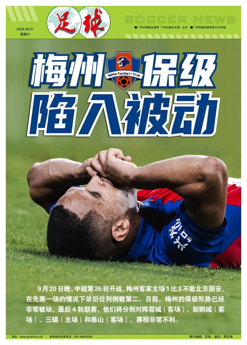 記者王偉報道 9月20日晚,中超第26輪先打一場,梅州客家主場迎戰北京國安,雖然一度扳平比分,但最終還是1比3不敵對手,依舊位列倒數第二。主場輸球,讓梅州的保級形勢變得非常被動,最後4輪聯賽,他們將分別對陣蓉城(客場)、新鵬城(客場)、三鎮(主場)和泰山(客場),賽程非常不利。
