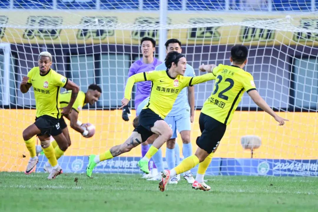 幸好,青島西海岸的運氣不錯,他們很快回過神來,並在第21分鐘獲得了入球——內爾松邊路突破助攻馬特烏斯遠射破門。這一次輪到新鵬城有點懵了,重新開球后沒多久,他們的防線再次出現問題,被內爾松右路連過兩人之後,橫傳中路助攻張修維破門,兩分鐘,青島西海岸就扳平了比分。