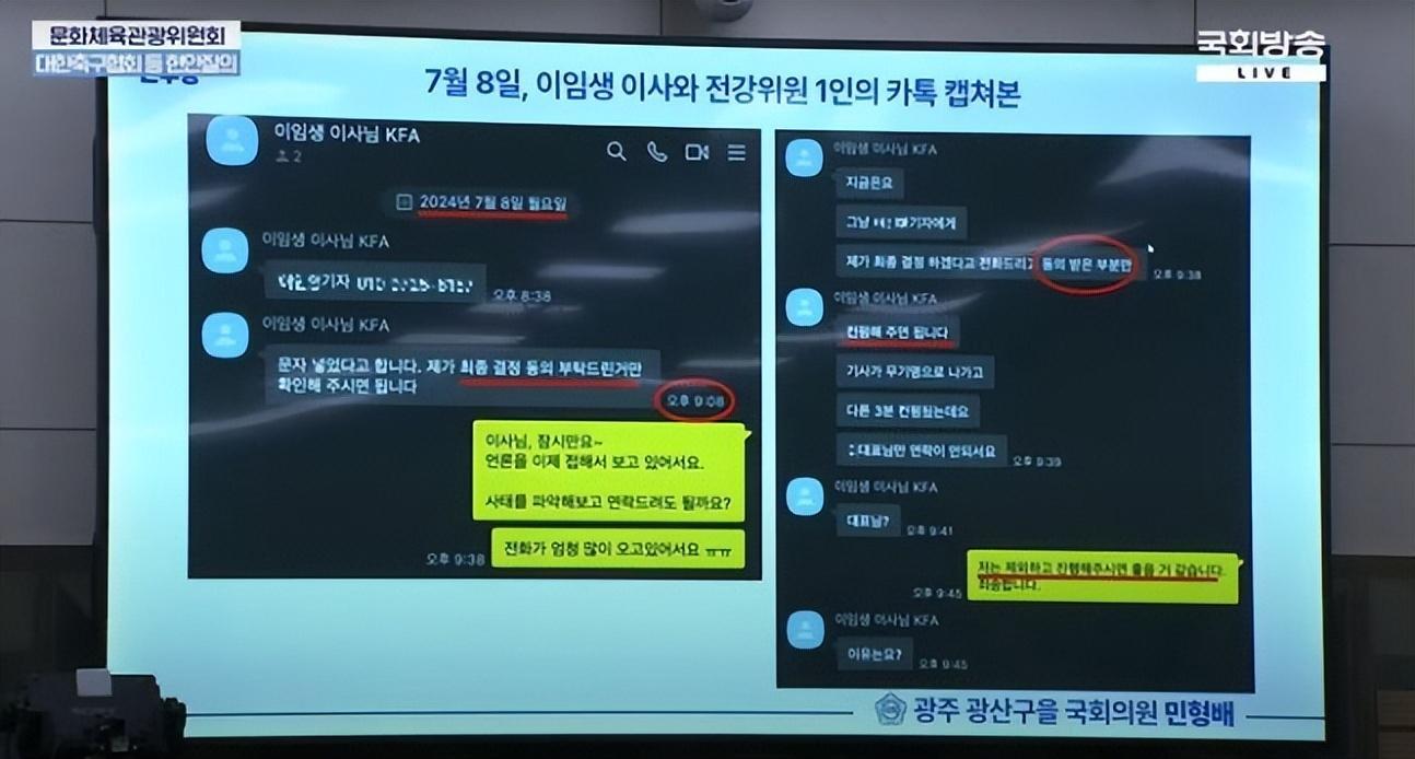 此次國會質詢,是韓國官方調查選帥醜聞的最新步驟,至少部分從當事人口中坐實了選帥程序存在不合規行爲。質詢從上午10點持續到下午13點,休息兩小時後15點繼續。議員公開了技術總監李林生與戰力強化委員會某位委員的對話記錄,對話發生在7月8日晚上9點,就是官宣洪明甫成爲韓國隊新帥次日。李林生爲回應媒體質疑,要求這位委員向記者確認自己和他討論過選定洪明甫爲新帥,但被該委員拒絕。
