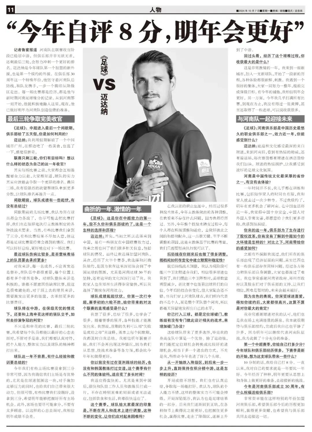 邁達納:首先,當初之所以選擇來到中國,是有一些朋友在中國聯賽效力過,我來之前也問了他們很多相關信息,包括球隊的情況,最終讓我選擇加盟河南隊。其次,經歷了大半個賽季,我選擇和河南隊續約,是因爲我在這裏深切體會到了中國足球的氛圍,尤其是河南足球30年的堅持,還有這裏的文化深深打動了我。我的家人也在鄭州生活得非常愉快,所以我選擇了繼續在河南效力。