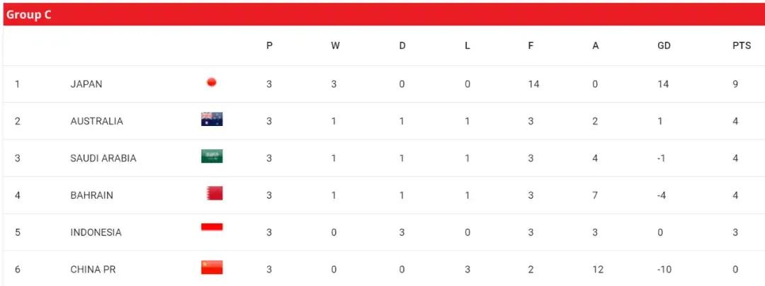 隨着澳大利亞主場擊敗國足,巴林主場逼平印尼,C組澳大利亞、沙特和巴林均積4分,印尼3戰全平積3分,四支球隊形成膠着的第二梯隊,爭奪剩餘的一個直接出線名額和兩個附加賽名額。國足則三戰全負,得失球2比12,雖然連場進球讓國足在進球數超過B組的科威特和巴勒斯坦排名18強賽倒數第三,但失球數在C組和18強賽都是斷崖式墊底。