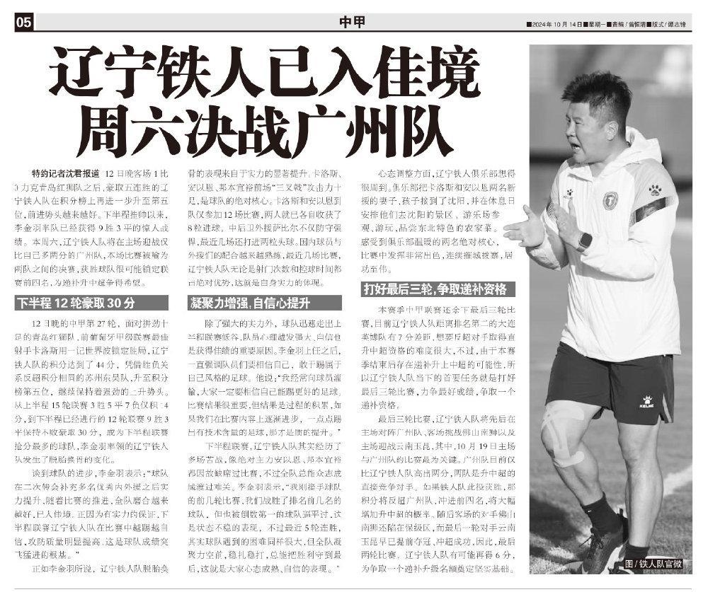 特約記者沈君報道 12日晚客場1比0力克青島紅獅隊之後,豪取五連勝的遼寧鐵人隊在積分榜上再進一步升至第五位,前進勢頭越來越好。下半程掛帥以來,李金羽率隊已經獲得9勝3平的驚人戰績。本週六,遼寧鐵人隊將在主場迎戰僅比自己多兩分的廣州隊,本場比賽被喻爲兩隊之間的決賽,獲勝球隊很可能鎖定聯賽前四名,爲遞補升中超爭得希望。
