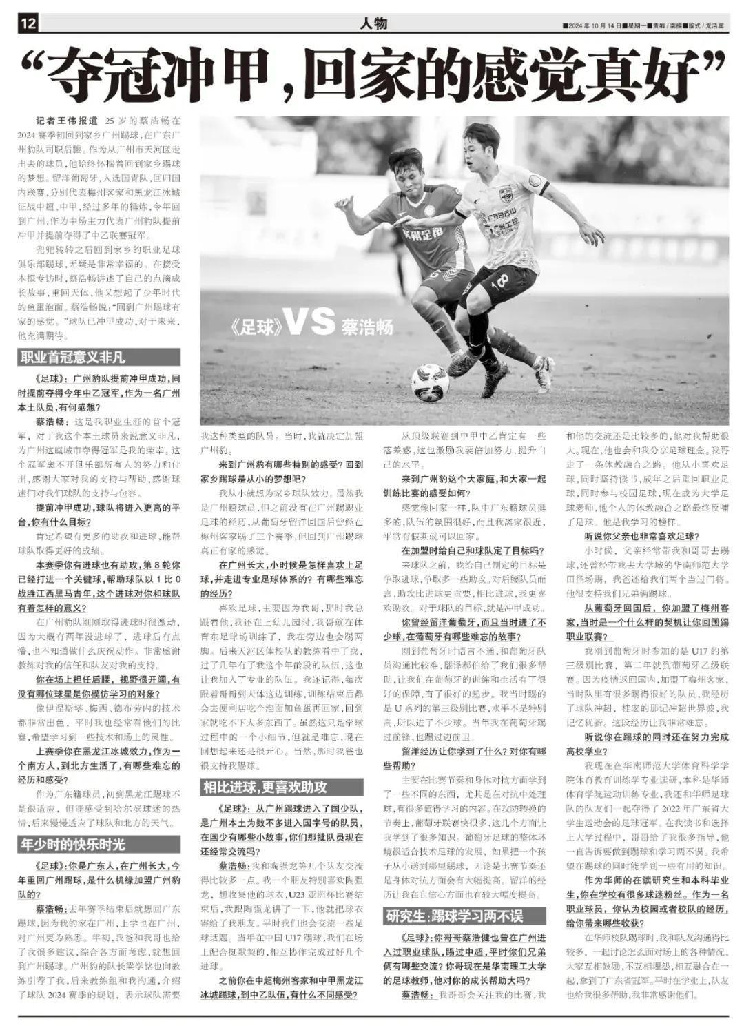 蔡浩暢:去年賽季結束後就想回廣東踢球,因爲我的家在廣州,上學也在廣州,對廣州更爲熟悉。年初,我爸和我哥也給了我很多建議,綜合各方面考慮,就想回到廣州踢球。廣州豹的隊長梁學銘也向教練引薦了我,後來教練組和我溝通,介紹了球隊2024賽季的規劃,表示球隊需要我這種類型的隊員。當時,我就決定加盟廣州豹。