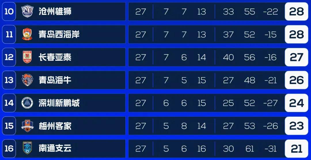 至於28分的兩支球隊滄州雄獅和青島西海岸,他們同樣只需一場勝利甚至一場平局就大概率保級,即便什麼都不做,也有直接保級的可能性。滄州雄獅接下來的比賽是主場對陣南通支雲,主場對陣上海海港,客場對陣青島海牛;青島西海岸則是客場對陣長春亞泰,主場對陣成都蓉城,客場對陣武漢三鎮。正常來講,他們都有望拿到分數。