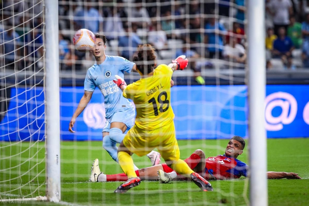 第 19 分鐘,深圳新鵬城右路斜傳至門前,埃杜-加西亞奮力爭頂頭球攻門,程月磊迅速倒地做出撲救。