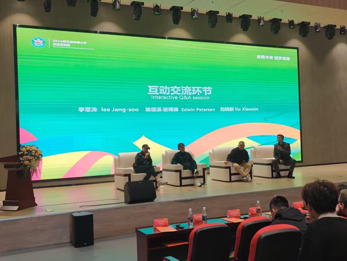 韓國名帥李章洙、陝西聯合主帥埃德文•彼得森以及足球報社社長劉曉新,分別做了主題演講。李章洙從職業足球探討青訓方向,埃德文則從球員發展的角度進行闡述,劉曉新重點從體教融合的角度進行了分享。三位行業大咖主題演講過後,進行了圓桌討論,並與現場的基層教練員互動。