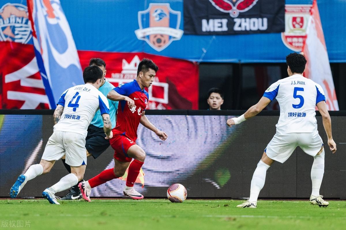第38分鐘,梅州客家的頭球攻門擊中遠端立柱,後續的補射也沒能敲開對方大門。