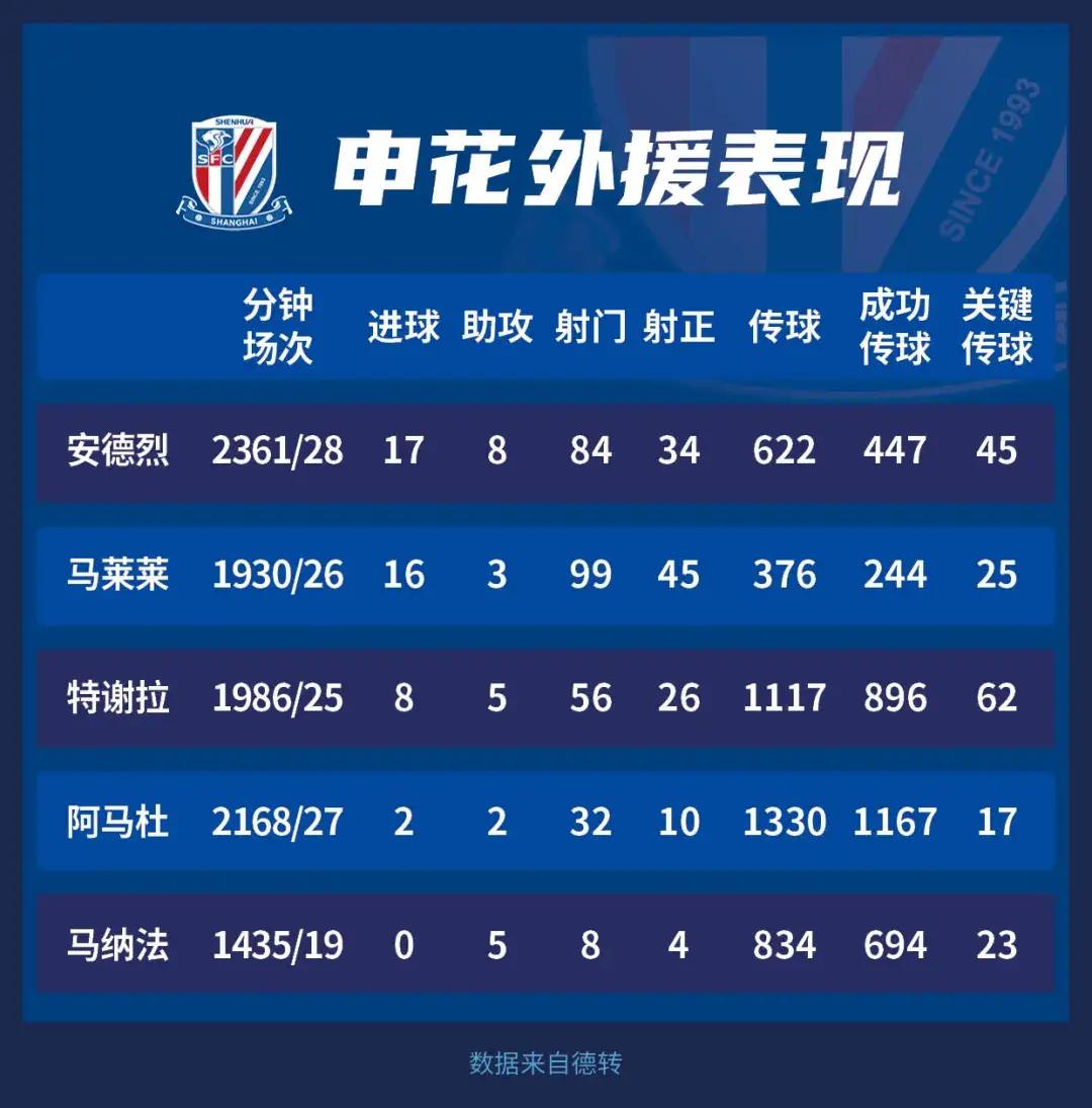 申花5外援出場時間明顯不如海港,只有安德烈、阿馬杜2人出場時間超過2000分鐘,特謝拉和馬萊萊接近2000分鐘,右後衛馬納法因左腓骨骨折只有19場出場的記錄,出場時間是1435分鐘。馬納法重傷,申花最後10輪至多隻有4外援可用,末輪馬納法傷愈復出只是替補出場。