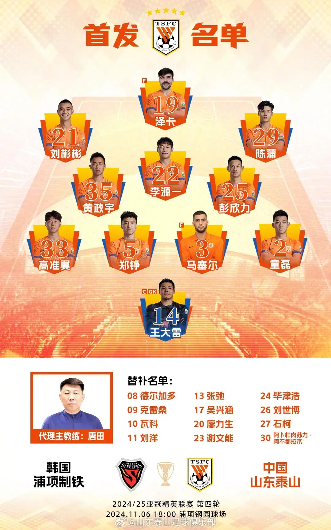 本場比賽,泰山隊的首發陣容是門將王大雷;後衛高準翼、鄭錚、馬塞爾和童磊;中場黃政宇、彭欣力、李源一、陳蒲和劉彬彬;突前前鋒是浦項舊將澤卡。